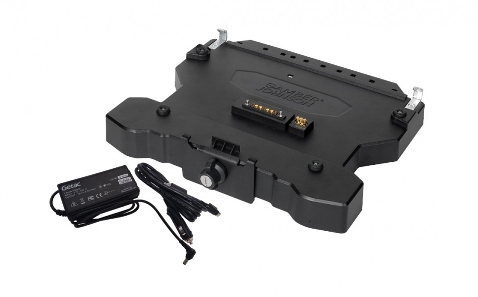 Loading... Please wait...Gamber-Johnson's S410 docking station is designed to mount a Getac S410 notebook in a fleet vehicle. The docking station is thin and light (4.47 lbs/2.03 kg) and features a spring-loaded connector to ensure connectivity even in the roughest terrain.